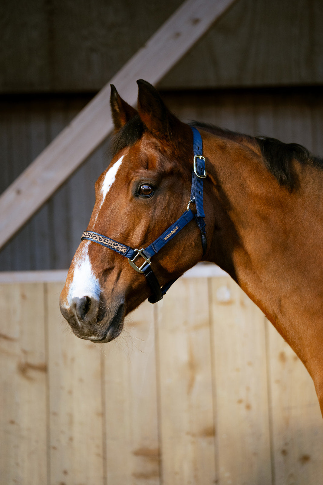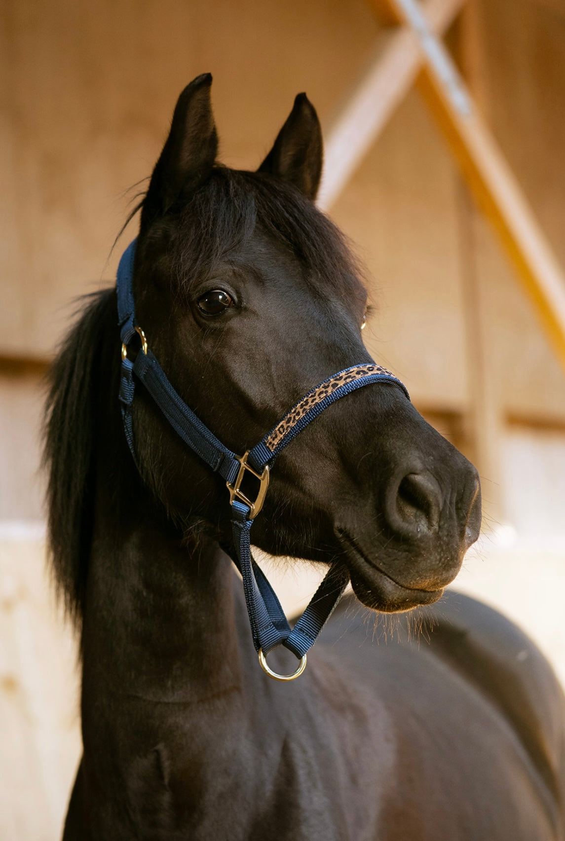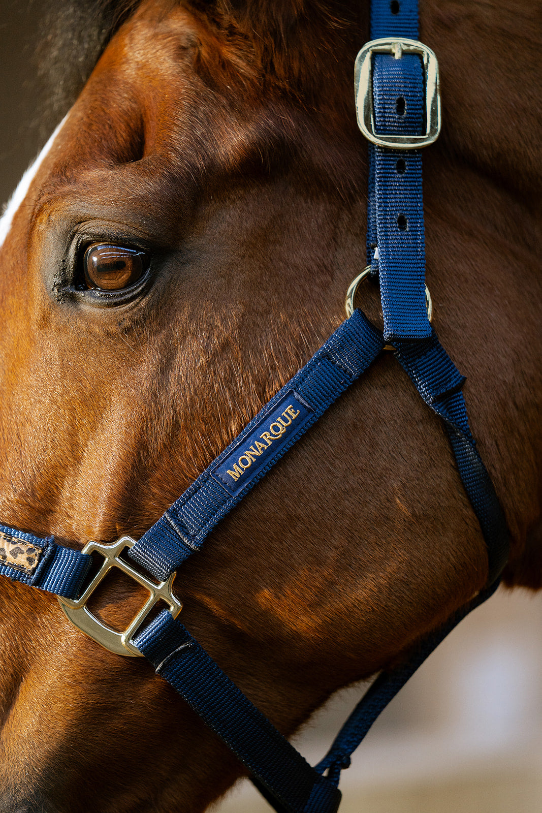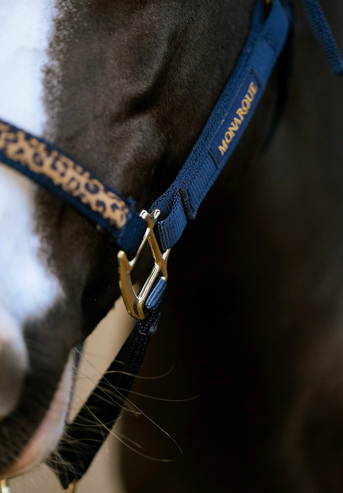 Licol Le Monarque bleu marine, liseré léopard, allie technicité, confort et style. Léger et résistant, il garantit précision et connexion optimale avec votre cheval.